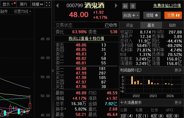 截至收盘,酒鬼酒股价上涨4.17%,成交额7.92亿元,与前一交易日(3.57亿元)相比翻倍。市值达156亿元,与盘前相比增加6.24亿元。